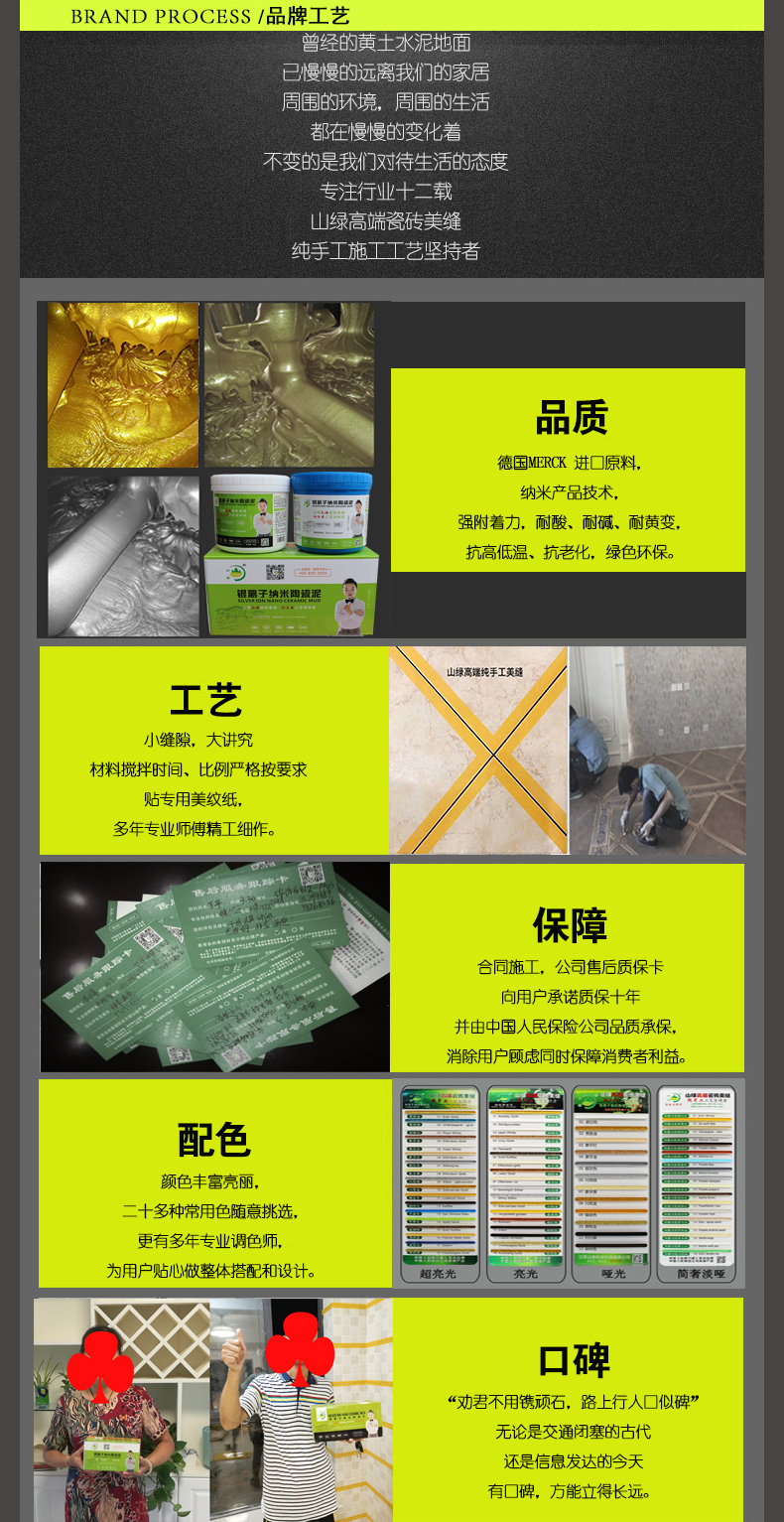 山綠公司旗下代理商已遍布全國一百多個省市地區(qū),施工人員均經(jīng)過公司專業(yè)技術培訓,隨著“山綠”品牌市場占有率越來越大,公司敬請廣大客戶可從以下幾點認準“山綠”正品,以保障自身權益:施工人員穿有“山綠”字樣的工作服;材料包裝上印有“山綠”LOGO;與工作人員簽訂的“山綠”品牌美縫協(xié)議。