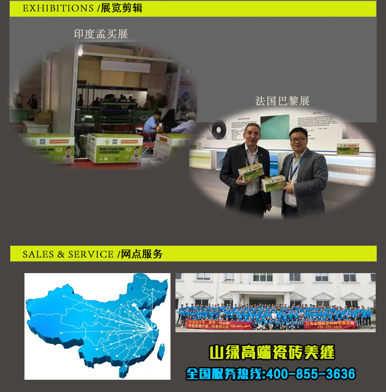山綠公司旗下代理商已遍布全國一百多個省市地區,施工人員均經過公司專業技術培訓,隨著“山綠”品牌市場占有率越來越大,公司敬請廣大客戶可從以下幾點認準“山綠”正品,以保障自身權益:施工人員穿有“山綠”字樣的工作服;材料包裝上印有“山綠”LOGO;與工作人員簽訂的“山綠”品牌美縫協議。